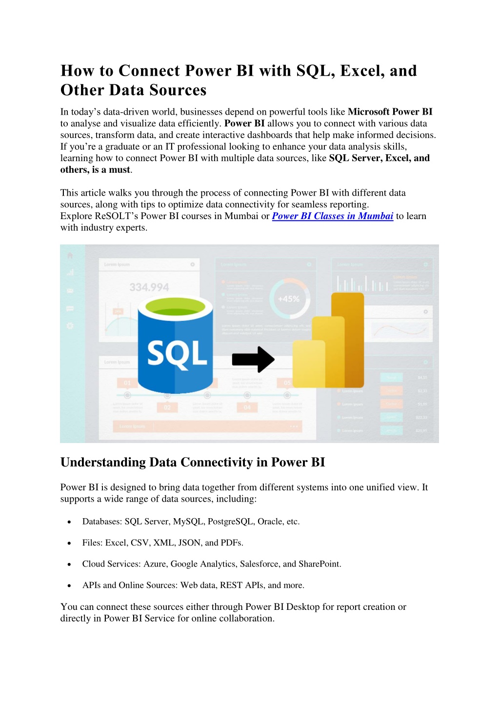 How to Connect Power BI with SQL, Excel, and Other Data Sources In today’s data-driven world, businesses depend on powerful tools like Microsoft Power BI to analyse and visualize data efficiently. Power BI allows you to connect with various data sources, transform data, and create interactive dashboards that help make informed decisions. If you’re a graduate or an IT professional looking to enhance your data analysis skills, learning how to connect Power BI with multiple data sources, like SQL Server, Excel, and others, is a must. This article walks you through the process of connecting Power BI with different data sources, along with tips to optimize data connectivity for seamless reporting. Explore ReSOLT’s Power BI courses in Mumbai or Power BI Classes in Mumbai to learn with industry experts. Understanding Data Connectivity in Power BI Power BI is designed to bring data together from different systems into one unified view. It supports a wide range of data sources, including: Databases: SQL Server, MySQL, PostgreSQL, Oracle, etc. Files: Excel, CSV, XML, JSON, and PDFs. Cloud Services: Azure, Google Analytics, Salesforce, and SharePoint. APIs and Online Sources: Web data, REST APIs, and more. You can connect these sources either through Power BI Desktop for report creation or directly in Power BI Service for online collaboration.