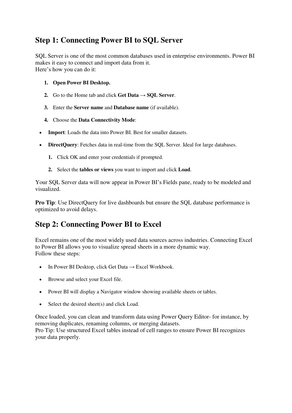 Step 3: Connecting Power BI to Other Data Sources Apart from SQL and Excel, Power BI offers seamless integration with hundreds of other data sources. Here are a few examples: 1.CSV or Text Files Go to Get Data → Text/CSV. Choose your file and review the data preview. Click Load or Transform Data for editing. 2.Web Data Choose Get Data → Web. Enter the URL of a website or a web API endpoint. Power BI fetches the HTML or JSON data, which you can transform before loading. 3.SharePoint or OneDrive For cloud-based files, select Get Data → SharePoint Folder or OneDrive. Sign in with your Microsoft credentials and connect directly to your online files. 4.Azure SQL Database Select Get Data → Azure → Azure SQL Database. Enter server and database details. Choose between Import or DirectQuery mode and load the data. Pro Tip: For cloud connections, always use OAuth2 authentication for better security and reliability. Step 4: Transforming and Cleaning Data After connecting to data sources, the next step is to prepare your data for analysis. Power BI includes a built-in tool called Power Query Editor that helps you clean, shape, and combine data before visualization. You can perform tasks like: Removing null values or duplicates. Changing data types. Merging or appending multiple tables. Creating custom columns using formulas (DAX). Pro Insight: Well-prepared data leads to accurate reports and faster dashboard performance. Spend time cleaning and transforming before visualization.