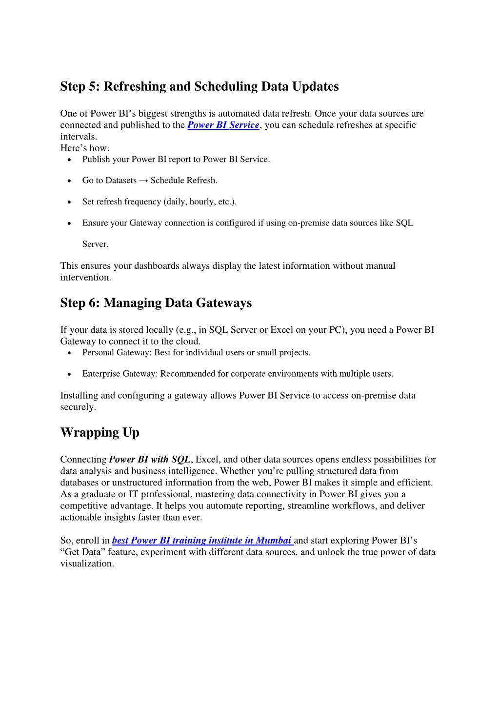 Step 5: Refreshing and Scheduling Data Updates One of Power BI’s biggest strengths is automated data refresh. Once your data sources are connected and published to the Power BI Service, you can schedule refreshes at specific intervals. Here’s how: Publish your Power BI report to Power BI Service. Go to Datasets → Schedule Refresh. Set refresh frequency (daily, hourly, etc.). Ensure your Gateway connection is configured if using on-premise data sources like SQL Server. This ensures your dashboards always display the latest information without manual intervention. Step 6: Managing Data Gateways If your data is stored locally (e.g., in SQL Server or Excel on your PC), you need a Power BI Gateway to connect it to the cloud. Personal Gateway: Best for individual users or small projects. Enterprise Gateway: Recommended for corporate environments with multiple users. Installing and configuring a gateway allows Power BI Service to access on-premise data securely. Wrapping Up Connecting Power BI with SQL, Excel, and other data sources opens endless possibilities for data analysis and business intelligence. Whether you’re pulling structured data from databases or unstructured information from the web, Power BI makes it simple and efficient. As a graduate or IT professional, mastering data connectivity in Power BI gives you a competitive advantage. It helps you automate reporting, streamline workflows, and deliver actionable insights faster than ever. So, enroll in best Power BI training institute in Mumbai and start exploring Power BI’s “GetData” feature, experiment with different data sources, and unlock the true power of data visualization.