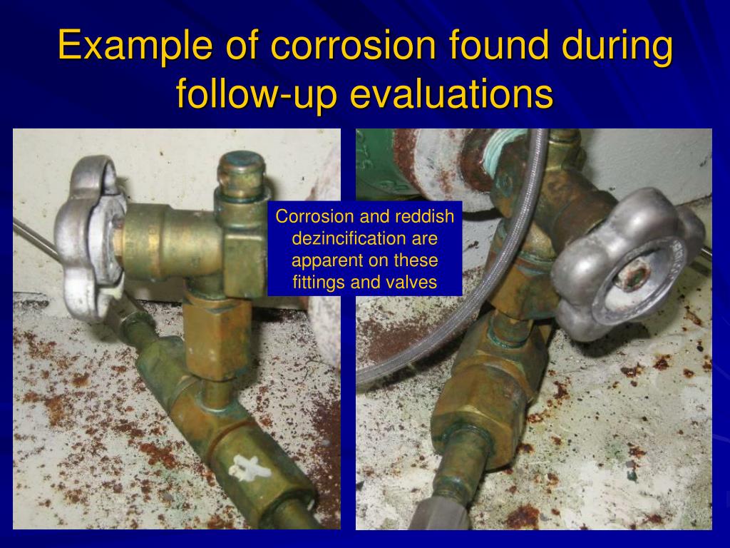 Example of corrosion found during follow-up evaluations Corrosion and reddish dezincification are apparent on these fittings and valves