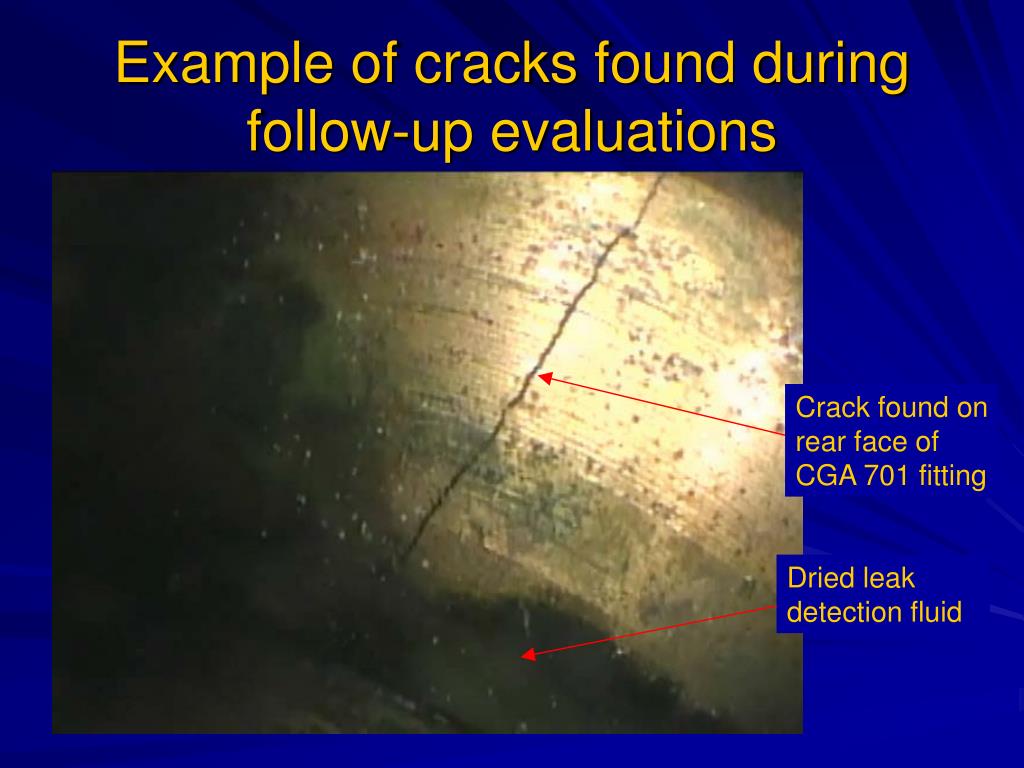 Example of cracks found during follow-up evaluations Crack found on rear face of CGA 701 fitting Dried leak detection fluid