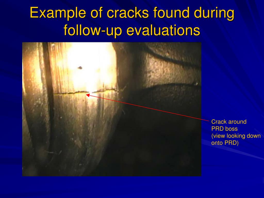 Example of cracks found during follow-up evaluations Crack around PRD boss (view looking down onto PRD)
