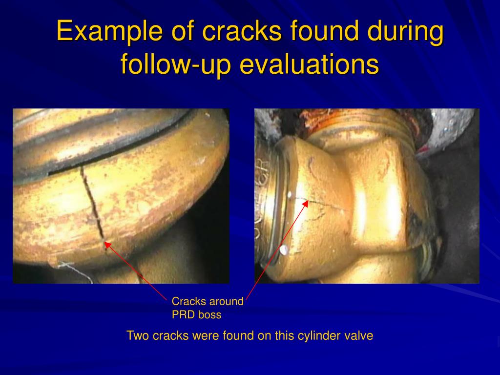 Example of cracks found during follow-up evaluations Cracks around PRD boss Two cracks were found on this cylinder valve