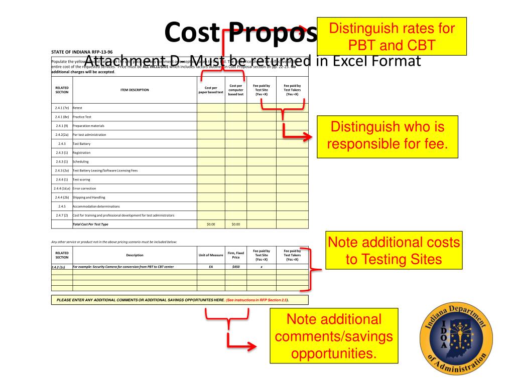 Cost ProposalAttachment D- Must be returned in Excel Format Distinguish rates for PBT and CBT Distinguish who is responsible for fee. Note additional costs to Testing Sites PLEASE ENTER ANY ADDITIONAL COMMENTS OR ADDITIONAL SAVINGS OPPORTUNITES HERE. (See instructions in RFP Section 2.5). Note additional comments/savings opportunities.