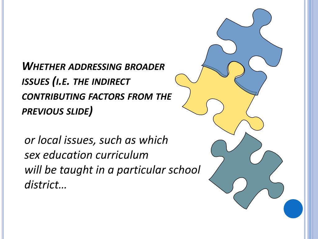 Whether addressing broader issues (i.e. the indirect contributing factors from the previous slide) or local issues, such as which sex education curriculum will be taught in a particular school district…