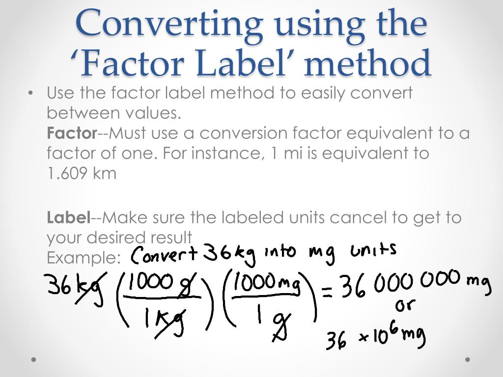 Converting using the ‘Factor Label’ method • Use the factor label method to easily convert between values.Factor--Must use a conversion factor equivalent to a factor of one. For instance, 1 mi is equivalent to 1.609 km Label--Make sure the labeled units cancel to get to your desired resultExample: