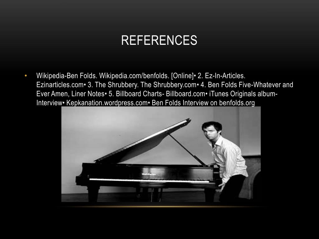 References • Wikipedia-Ben Folds. Wikipedia.com/benfolds. [Online]• 2. Ez-In-Articles. Ezinarticles.com• 3. The Shrubbery. The Shrubbery.com• 4. Ben Folds Five-Whatever and Ever Amen, Liner Notes• 5. Billboard Charts- Billboard.com• iTunes Originals album-Interview• Kepkanation.wordpress.com• Ben Folds Interview on benfolds.org