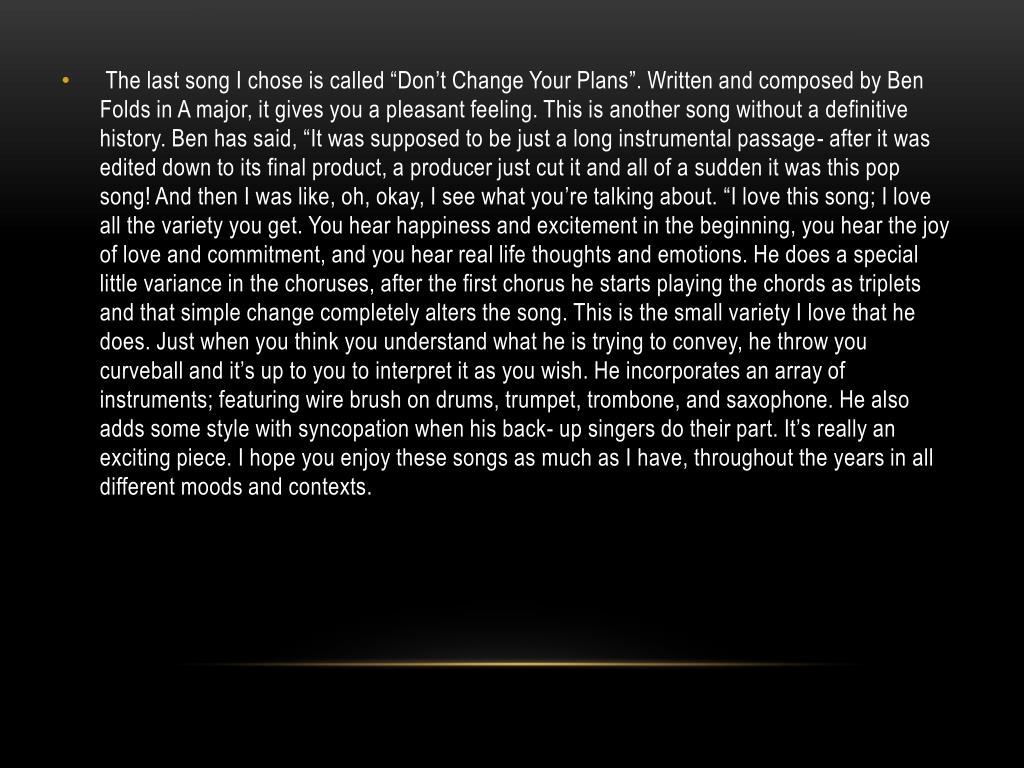 “Don’t Change Your plans” • • “Don’t Change Your Plans” Music and Lyrics by Ben Folds- A major• 0:00 Introduction- a single string instrument starts us out getting louder as it’s played. You hear the first piano chord slam.• 0:11 Strings make an entrance introducing the wire brush on drums and the first verse.• 0:33 Chorus “All I really wanna say, you’re the reason I wanna stay”.• 0:47 Piano stops but you still hear the brush on drums. Verse 2 begins, this time with more drum and a louder and more decorated piano.• 1:06 Break in piano that leads us to the bridge, “Don’t change your plans for me” with some soft strings.• 1:48 Drums return adding our familiar beat while painting a picture of the “leaves falling back East”• 1:57 Instrumental break- the piano and back-up vocals begin. The piano is now playing excited triplets while the back-up “Ah- ah-ah-ah-ah’s” are adding a bit of confusion. You’ll also begin to hear an electric guitar which is almost never employed by Ben Folds. It creates a bit of a dragging sound.• 2:22 Here comes the trumpet adding to the excitement of the scene, with all instruments coming together and drums quickening pace.• 2:35 Strings enter playing a soft yet essential part of the theme.• 2:49Everything starts slowing with strings making the closing statement• 2:57 Verse 3 “Beautifully we smile again, in fact I might be sore from it” has the piano and some sort of echo.• 3:14 Chorus- this time sounding more mellow. You will hear a very soft high hat as well as some soft strings and bells.• 3:40 Brush returns to the drums and bass guitar enters adding to the chorus• 3:50 Piano and bell rings on the downbeat highlighting the chords. Drums enter.• 3:57 Whistle- this is very simple but adds a lot of character to this section after all the chaos. It seems there is some relief.• 4:07 All instruments back together for chorus with a variation of the lyrics. “But destiny is calling”• 4:22 Back up “ah, ah, ah’s” with trumpets adding a little noise here• 4:37 Coda- “I love you, goodbye” tells you things are ending. Piano playing soft triplets and strings adding to it.