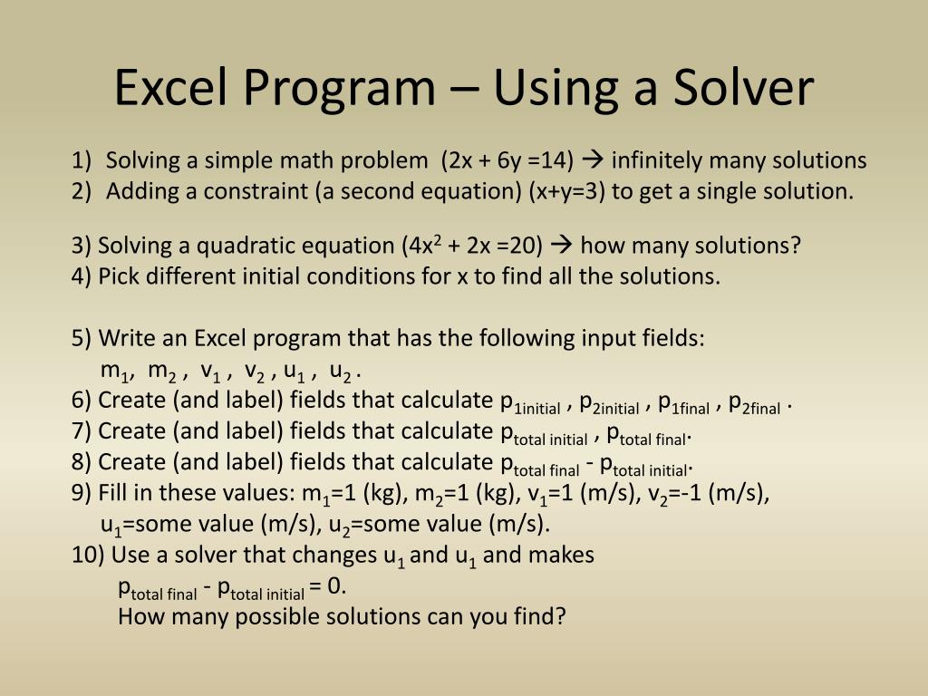 Excel Program – Using a Solver Solving a simple math problem (2x + 6y =14) infinitely many solutions Adding a constraint (a second equation) (x+y=3) to get a single solution. 3) Solving a quadratic equation (4x2 + 2x =20) how many solutions? 4) Pick different initial conditions for x to find all the solutions. 5) Write an Excel program that has the following input fields: m1, m2 , v1 , v2 , u1 , u2 . 6) Create (and label) fields that calculate p1initial , p2initial , p1final , p2final . 7) Create (and label) fields that calculate ptotal initial , ptotal final. 8) Create (and label) fields that calculate ptotal final - ptotal initial. 9) Fill in these values: m1=1 (kg), m2=1 (kg), v1=1 (m/s), v2=-1 (m/s), u1=some value (m/s), u2=some value (m/s). 10) Use a solver that changes u1 and u1 and makes ptotal final - ptotal initial = 0. How many possible solutions can you find?