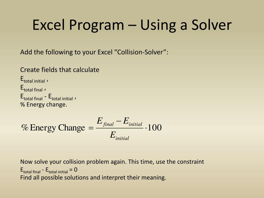 Excel Program – Using a Solver Add the following to your Excel “Collision-Solver”: Create fields that calculate Etotal initial , Etotal final , Etotal final - Etotal initial , % Energy change. Now solve your collision problem again. This time, use the constraint Etotal final - Etotal initial = 0 Find all possible solutions and interpret their meaning.