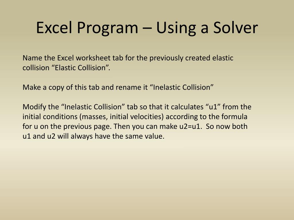Excel Program – Using a Solver Name the Excel worksheet tab for the previously created elastic collision “Elastic Collision”. Make a copy of this tab and rename it “Inelastic Collision” Modify the “Inelastic Collision” tab so that it calculates “u1” from the initial conditions (masses, initial velocities) according to the formula for u on the previous page. Then you can make u2=u1. So now both u1 and u2 will always have the same value.