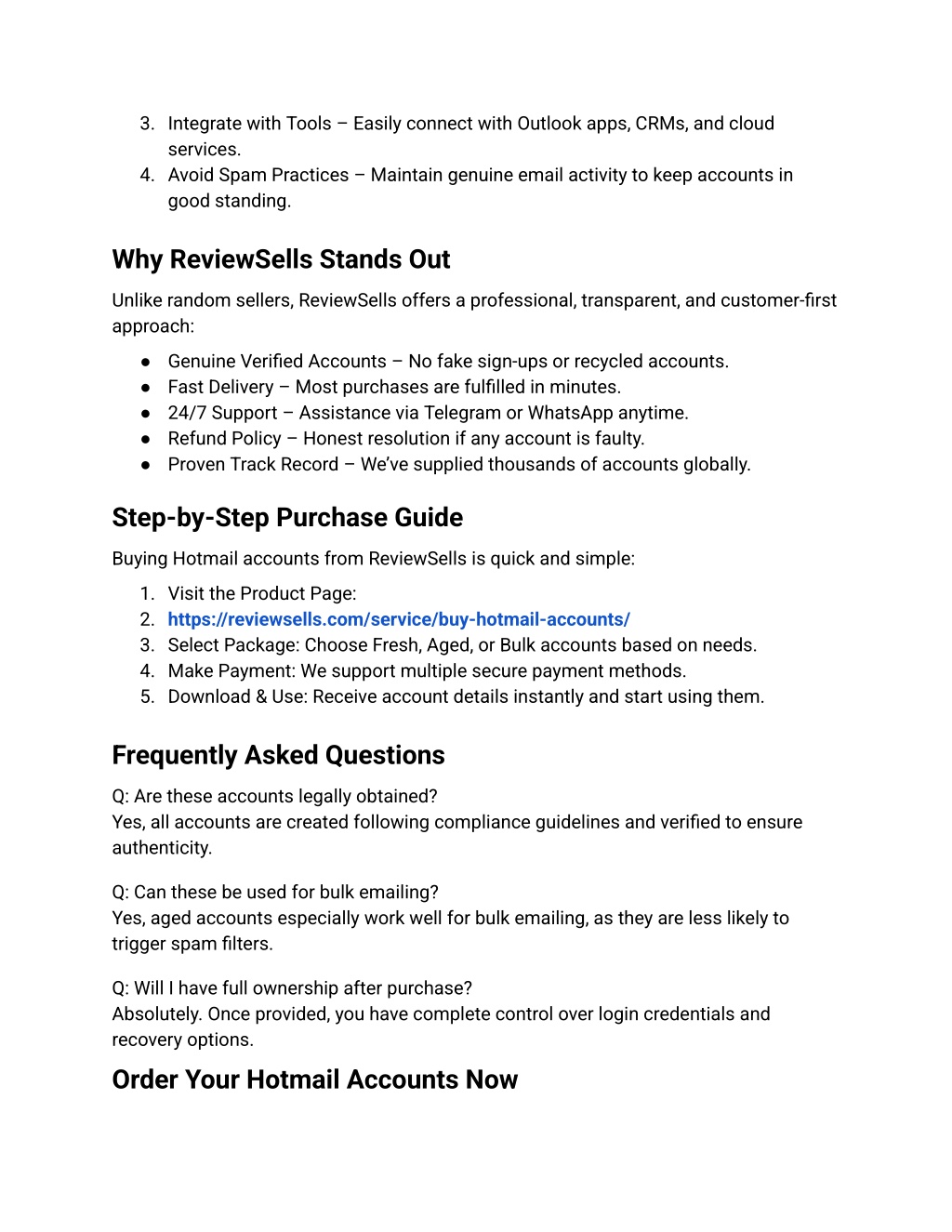 4. 3. Integrate with Tools – Easily connect with Outlook apps, CRMs, and cloud services. 4. Avoid Spam Practices – Maintain genuine email activity to keep accounts in good standing. Why ReviewSells Stands Out Unlike random sellers, ReviewSells offers a professional, transparent, and customer-first approach: ● Genuine Verified Accounts – No fake sign-ups or recycled accounts. ● Fast Delivery – Most purchases are fulfilled in minutes. ● 24/7 Support – Assistance via Telegram or WhatsApp anytime. ● Refund Policy – Honest resolution if any account is faulty. ● Proven Track Record – We’ve supplied thousands of accounts globally. Step-by-Step Purchase Guide Buying Hotmail accounts from ReviewSells is quick and simple: 1. Visit the Product Page: 2. https://reviewsells.com/service/buy-hotmail-accounts/ 3. Select Package: Choose Fresh, Aged, or Bulk accounts based on needs. 4. Make Payment: We support multiple secure payment methods. 5. Download & Use: Receive account details instantly and start using them. Frequently Asked Questions Q: Are these accounts legally obtained? Yes, all accounts are created following compliance guidelines and verified to ensure authenticity. Q: Can these be used for bulk emailing? Yes, aged accounts especially work well for bulk emailing, as they are less likely to trigger spam filters. Q: Will I have full ownership after purchase? Absolutely. Once provided, you have complete control over login credentials and recovery options. Order Your Hotmail Accounts Now