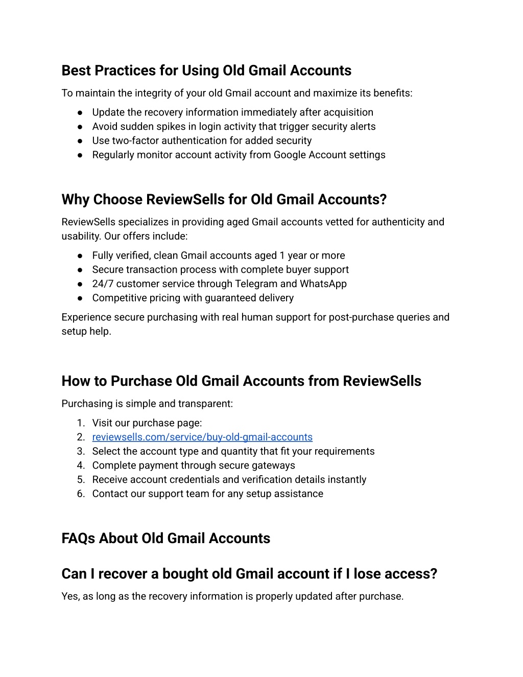 3. Best Practices for Using Old Gmail Accounts To maintain the integrity of your old Gmail account and maximize its benefits: ● Update the recovery information immediately after acquisition ● Avoid sudden spikes in login activity that trigger security alerts ● Use two-factor authentication for added security ● Regularly monitor account activity from Google Account settings Why Choose ReviewSells for Old Gmail Accounts? ReviewSells specializes in providing aged Gmail accounts vetted for authenticity and usability. Our offers include: ● Fully verified, clean Gmail accounts aged 1 year or more ● Secure transaction process with complete buyer support ● 24/7 customer service through Telegram and WhatsApp ● Competitive pricing with guaranteed delivery Experience secure purchasing with real human support for post-purchase queries and setup help. How to Purchase Old Gmail Accounts from ReviewSells Purchasing is simple and transparent: 1. Visit our purchase page: 2. reviewsells.com/service/buy-old-gmail-accounts 3. Select the account type and quantity that fit your requirements 4. Complete payment through secure gateways 5. Receive account credentials and verification details instantly 6. Contact our support team for any setup assistance FAQs About Old Gmail Accounts Can I recover a bought old Gmail account if I lose access? Yes, as long as the recovery information is properly updated after purchase.