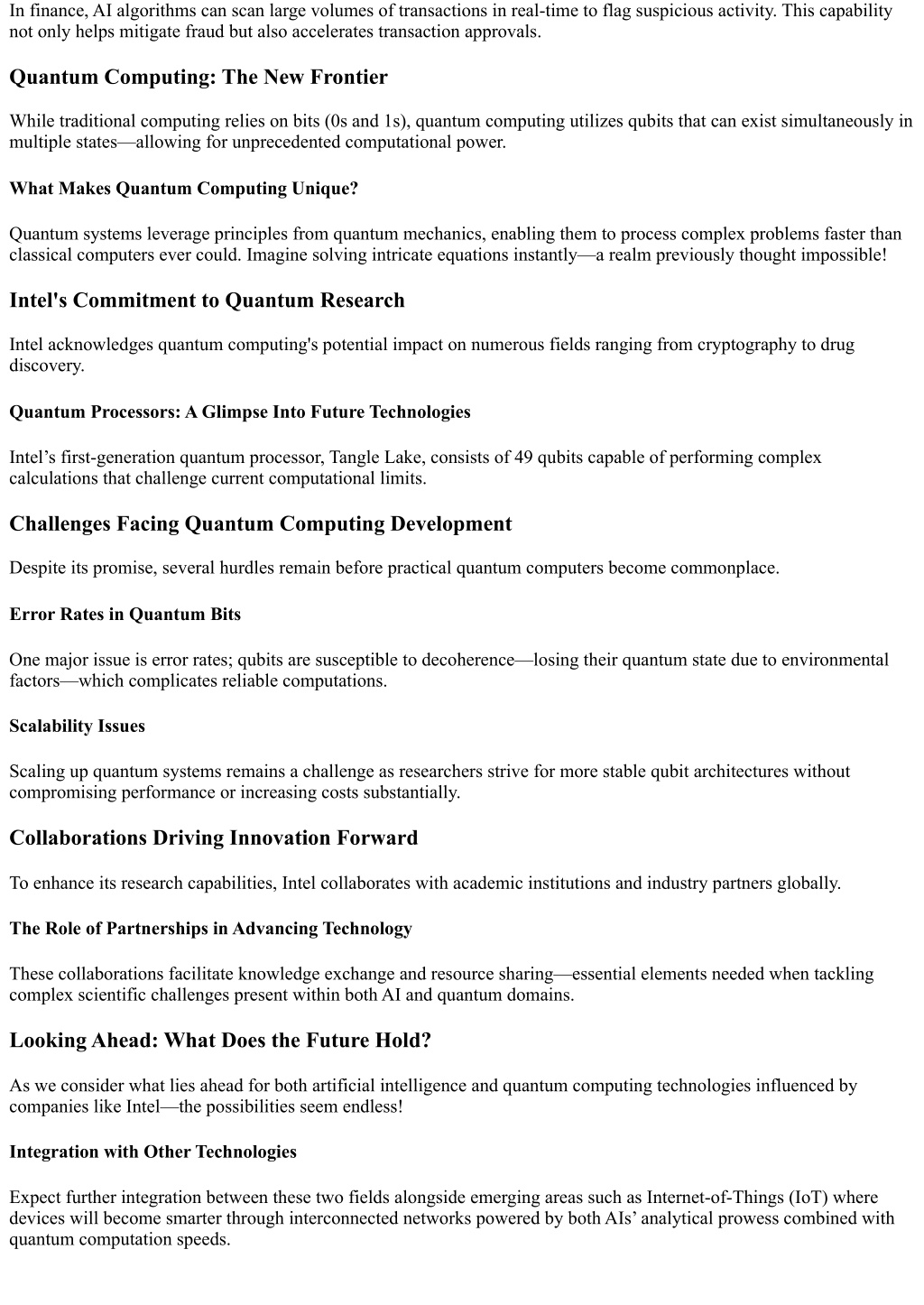 In finance, AI algorithms can scan large volumes of transactions in real-time to flag suspicious activity. This capability not only helps mitigate fraud but also accelerates transaction approvals. Quantum Computing: The New Frontier While traditional computing relies on bits (0s and 1s), quantum computing utilizes qubits that can exist simultaneously in multiple states—allowing for unprecedented computational power. What Makes Quantum Computing Unique? Quantum systems leverage principles from quantum mechanics, enabling them to process complex problems faster than classical computers ever could. Imagine solving intricate equations instantly—a realm previously thought impossible! Intel's Commitment to Quantum Research Intel acknowledges quantum computing's potential impact on numerous fields ranging from cryptography to drug discovery. Quantum Processors: A Glimpse Into Future Technologies Intel’s first-generation quantum processor, Tangle Lake, consists of 49 qubits capable of performing complex calculations that challenge current computational limits. Challenges Facing Quantum Computing Development Despite its promise, several hurdles remain before practical quantum computers become commonplace. Error Rates in Quantum Bits One major issue is error rates; qubits are susceptible to decoherence—losing their quantum state due to environmental factors—which complicates reliable computations. Scalability Issues Scaling up quantum systems remains a challenge as researchers strive for more stable qubit architectures without compromising performance or increasing costs substantially. Collaborations Driving Innovation Forward To enhance its research capabilities, Intel collaborates with academic institutions and industry partners globally. The Role of Partnerships in Advancing Technology These collaborations facilitate knowledge exchange and resource sharing—essential elements needed when tackling complex scientific challenges present within both AI and quantum domains. Looking Ahead: What Does the Future Hold? As we consider what lies ahead for both artificial intelligence and quantum computing technologies influenced by companies like Intel—the possibilities seem endless! Integration with Other Technologies Expect further integration between these two fields alongside emerging areas such as Internet-of-Things (IoT) where devices will become smarter through interconnected networks powered by both AIs’ analytical prowess combined with quantum computation speeds.