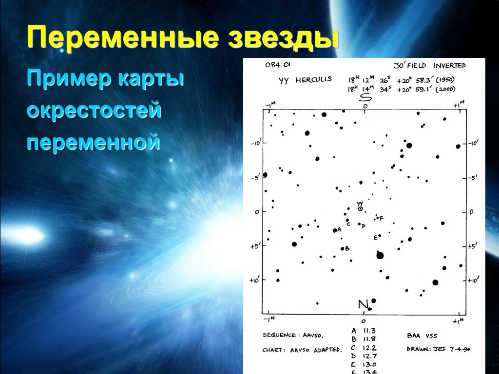 Переменные звезды • В основу метода определения блеска звезд положено сравнение их с соседними звездами, блеск которых хорошо известен и не меняется со временем. • Такие звезды называют звездами сравнения. • Заранее выбирается несколько звезд сравнения, имеющих блеск в промежутке изменения блеска переменной. • Звезды сравнения должны находиться как можно ближе к исследуемой переменной, в пределах поля зрения инструмента. • Разница блеска между звездами сравнения должна быть не больше 0,4-0,5m, а цвет не должен сильно отличаться от цвета переменной. • Карты окрестностей наиболее ярких переменных звезд публикуются в Школьном Астрономическом календаре-ежегоднике и в Справочнике Любителя Астрономии под редакцией П.Г.Куликовского. • Подробные карты окрестностей с указанием звезд сравнения для множества переменных доступны через Интернет на сайте Ассоциации Наблюдателей Переменных Звезд (AAVSO) по адресу http://www.aavso.org/vsp Методы наблюдений переменных звезд