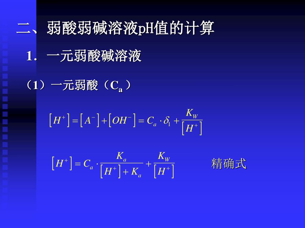 1.一元弱酸碱溶液 (1)一元弱酸(Ca ) 二、弱酸弱碱溶液pH值的计算 精确式