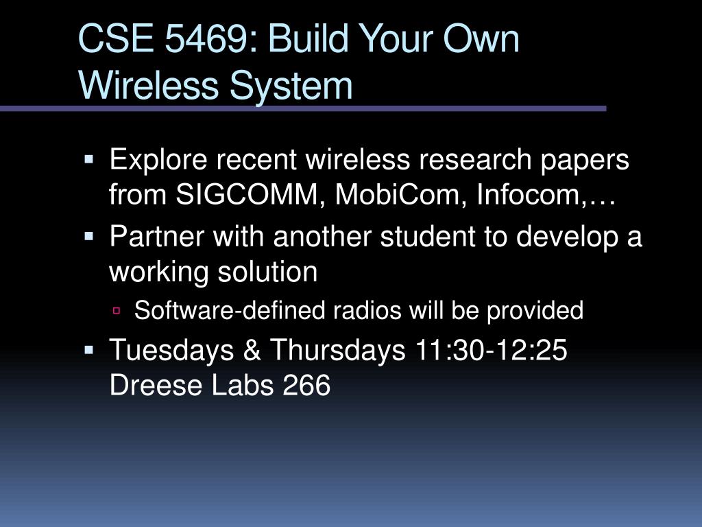 CSE 5469: Build Your Own Wireless System • Explore recent wireless research papers from SIGCOMM, MobiCom, Infocom,… • Partner with another student to develop a working solution • Software-defined radios will be provided • Tuesdays & Thursdays 11:30-12:25Dreese Labs 266