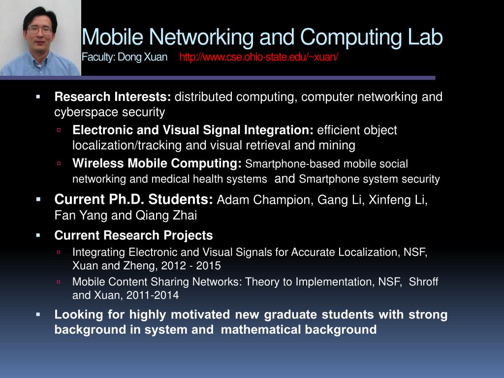 Mobile Networking and Computing LabFaculty: Dong Xuan http://www.cse.ohio-state.edu/~xuan/ • Research Interests: distributed computing, computer networking and cyberspace security • Electronic and Visual Signal Integration: efficient object localization/tracking and visual retrieval and mining • Wireless Mobile Computing: Smartphone-based mobile social networking and medical health systems and Smartphone system security • Current Ph.D. Students: Adam Champion, Gang Li, Xinfeng Li, Fan Yang and Qiang Zhai • Current Research Projects • Integrating Electronic and Visual Signals for Accurate Localization, NSF, Xuan and Zheng, 2012 - 2015 • Mobile Content Sharing Networks: Theory to Implementation, NSF, Shroff and Xuan, 2011-2014 • Looking for highly motivated new graduate students with strong background in system and mathematical background