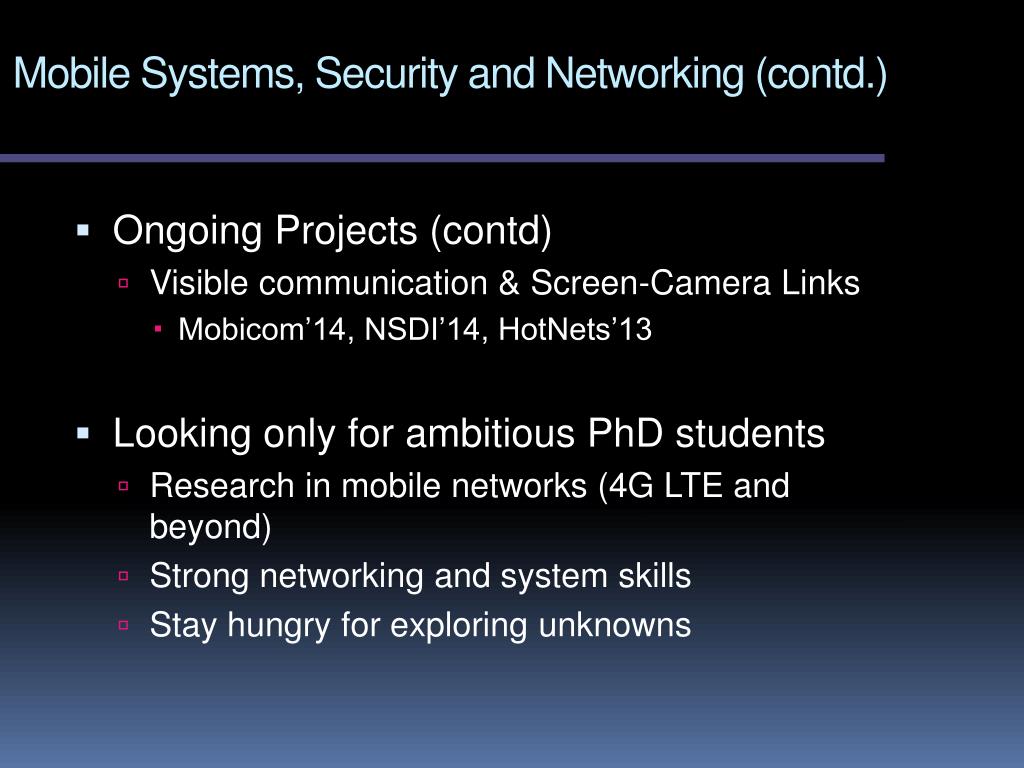 Mobile Systems, Security and Networking (contd.) • Ongoing Projects (contd) • Visible communication & Screen-Camera Links • Mobicom’14, NSDI’14, HotNets’13 • Looking only for ambitious PhD students • Research in mobile networks (4G LTE and beyond) • Strong networking and system skills • Stay hungry for exploring unknowns