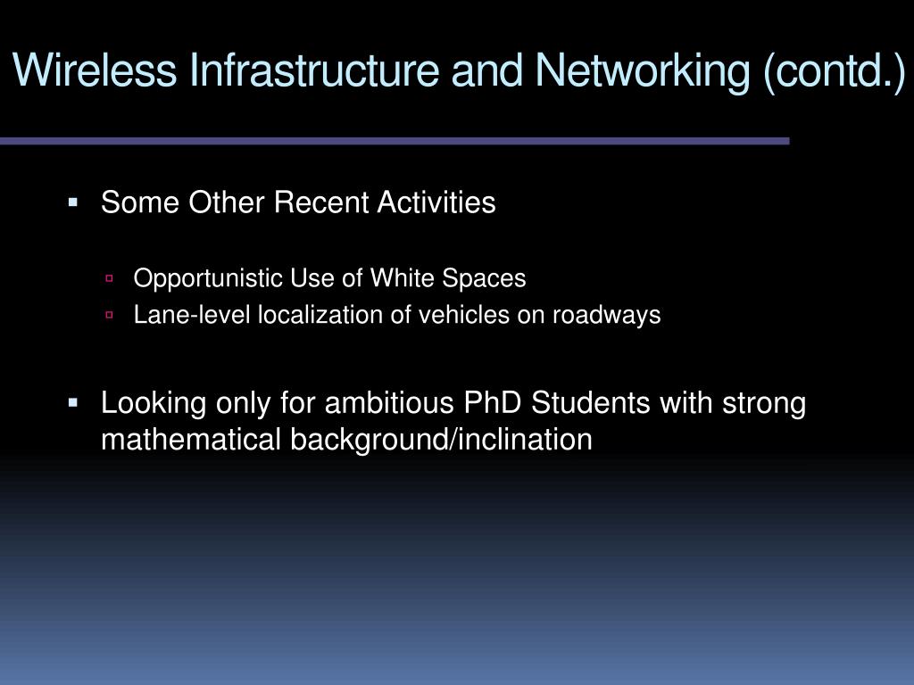 Wireless Infrastructure and Networking (contd.) • Some Other Recent Activities • Opportunistic Use of White Spaces • Lane-level localization of vehicles on roadways • Looking only for ambitious PhD Students with strong mathematical background/inclination