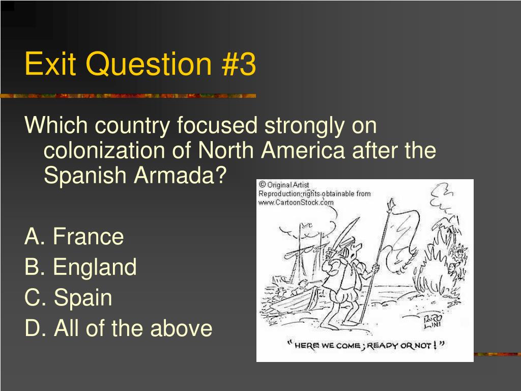 Exit Question #3 Which country focused strongly on colonization of North America after the Spanish Armada? A. France B. England C. Spain D. All of the above