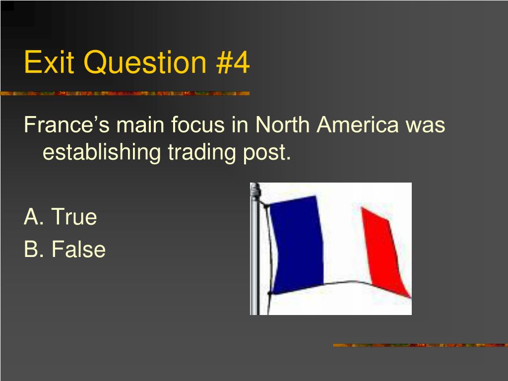 Exit Question #4 France’s main focus in North America was establishing trading post. A. True B. False