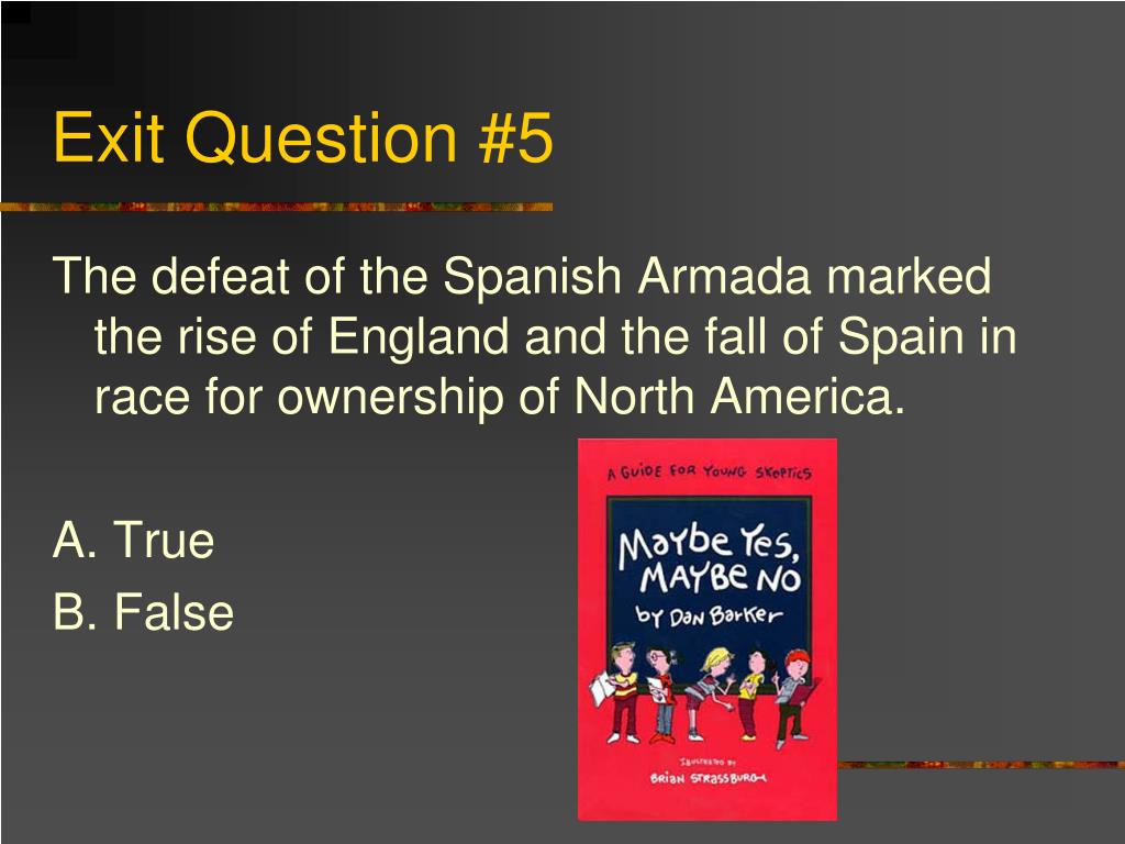 Exit Question #5 The defeat of the Spanish Armada marked the rise of England and the fall of Spain in race for ownership of North America. A. True B. False