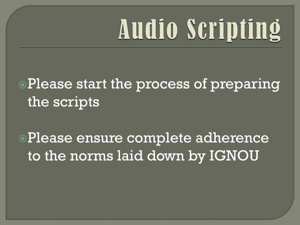 Audio Scripting Please start the process of preparing the scripts Please ensure complete adherence to the norms laid down by IGNOU