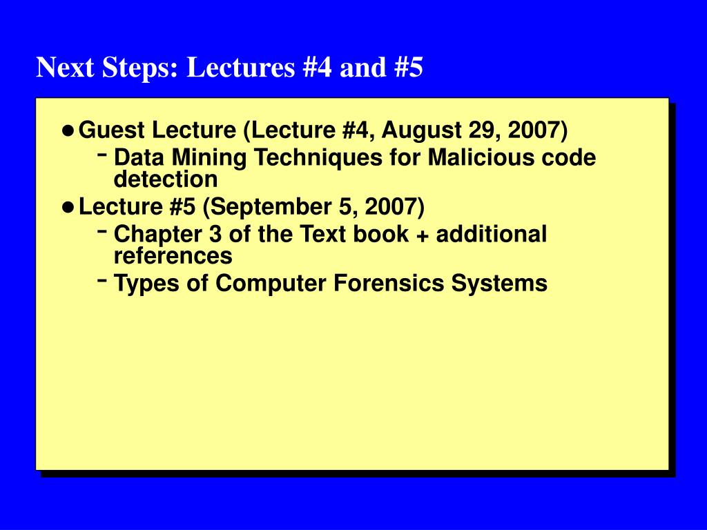 Next Steps: Lectures #4 and #5 • Guest Lecture (Lecture #4, August 29, 2007) • Data Mining Techniques for Malicious code detection • Lecture #5 (September 5, 2007) • Chapter 3 of the Text book + additional references • Types of Computer Forensics Systems