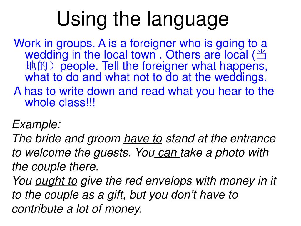Using the language Work in groups. A is a foreigner who is going to a wedding in the local town . Others are local (当地的)people. Tell the foreigner what happens, what to do and what not to do at the weddings. A has to write down and read what you hear to the whole class!!! Example: The bride and groom have to stand at the entrance to welcome the guests. You can take a photo with the couple there. You ought to give the red envelops with money in it to the couple as a gift, but you don’t have to contribute a lot of money.