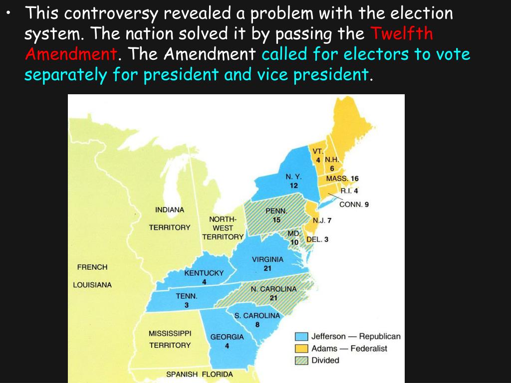 This controversy revealed a problem with the election system. The nation solved it by passing the Twelfth Amendment. The Amendment called for electors to vote separately for president and vice president.