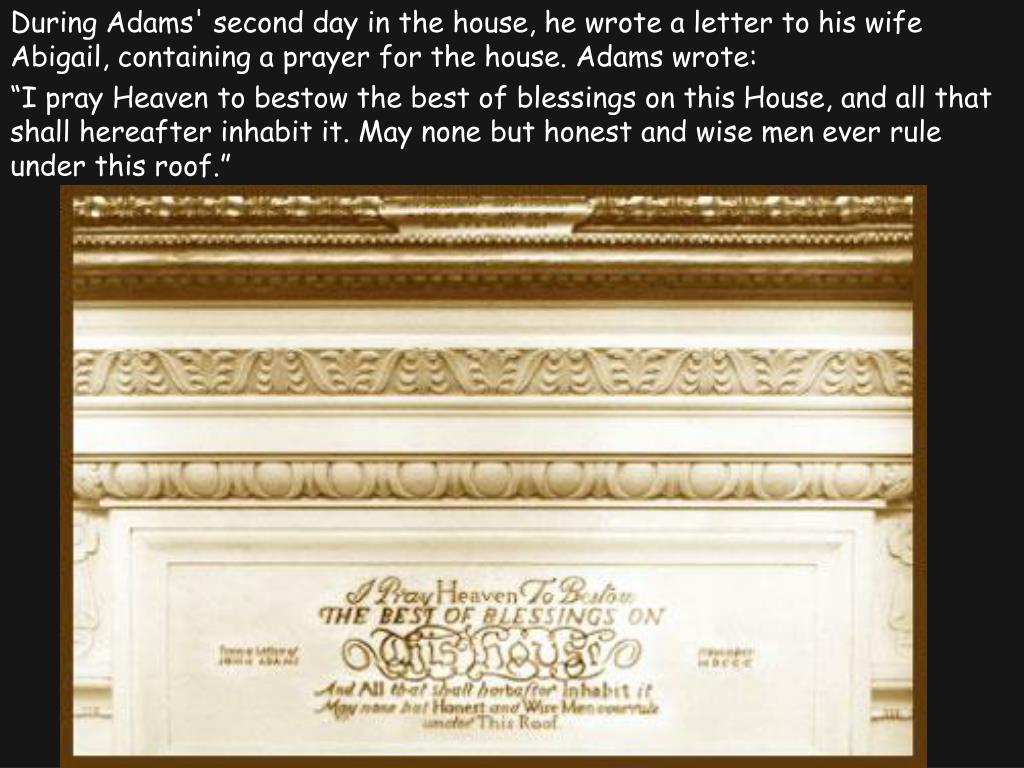 During Adams' second day in the house, he wrote a letter to his wife Abigail, containing a prayer for the house. Adams wrote: “I pray Heaven to bestow the best of blessings on this House, and all that shall hereafter inhabit it. May none but honest and wise men ever rule under this roof.”