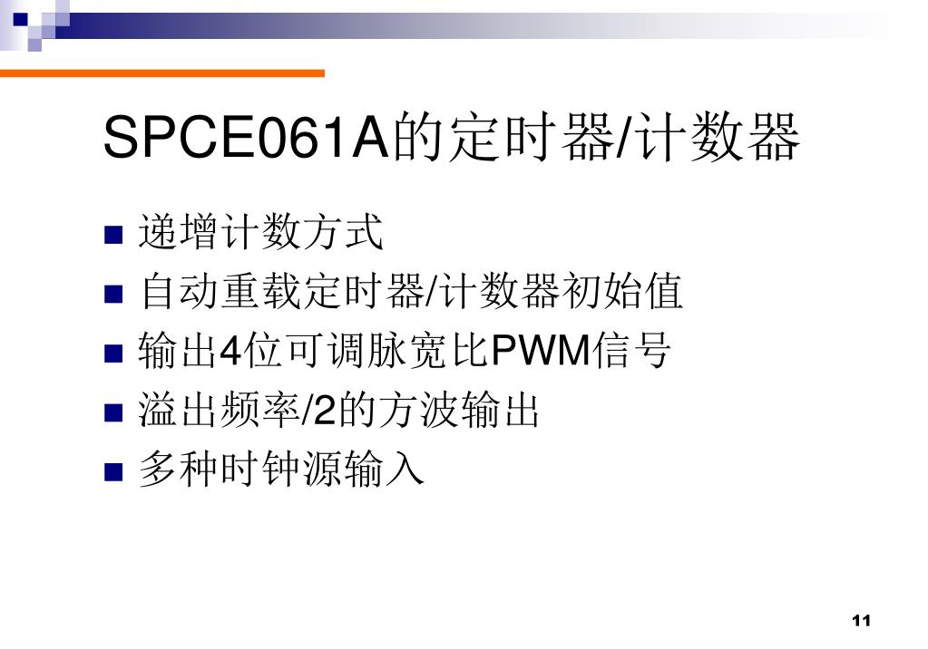 SPCE061A的定时器/计数器 • 递增计数方式 • 自动重载定时器/计数器初始值 • 输出4位可调脉宽比PWM信号 • 溢出频率/2的方波输出 • 多种时钟源输入