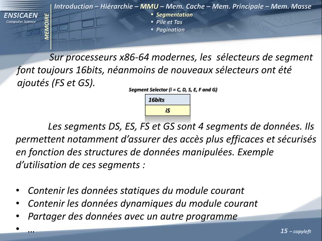 Introduction – Hiérarchie – MMU– Mem.Cache – Mem. Principale – Mem. Masse Segmentation Pile et Tas Pagination MEMOIRE Sur processeurs x86-64 modernes, les sélecteurs de segment font toujours 16bits, néanmoins de nouveaux sélecteurs ont été ajoutés (FS et GS). Segment Selector (i = C, D, S, E, F and G) Les segments DS, ES, FS et GS sont 4 segments de données. Ils permettent notamment d’assurer des accès plus efficaces et sécurisés en fonction des structures de données manipulées. Exemple d’utilisation de ces segments : Contenir les données statiques du module courant Contenir les données dynamiques du module courant Partager des données avec un autre programme …