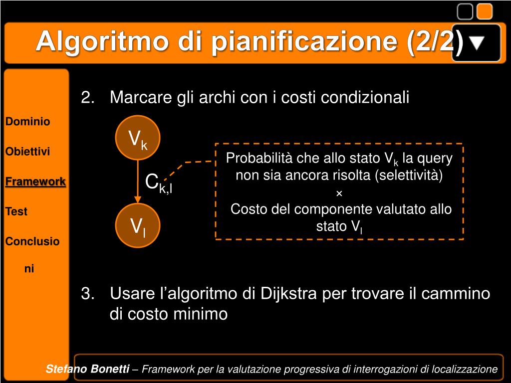 Algoritmo di pianificazione (1/2) Dominio Obiettivi Framework Test Conclusioni Problema: data una query, quali componenti è meglio valutare per minimizzare i costi? Algoritmo di pianificazione • Generare una rete degli stati Stefano Bonetti – Framework per la valutazione progressiva di interrogazioni di localizzazione