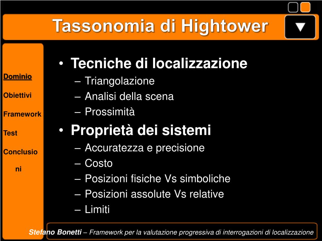 Tassonomia di Hightower Dominio Obiettivi Framework Test Conclusioni • Tecniche di localizzazione • Triangolazione • Analisi della scena • Prossimità • Proprietà dei sistemi • Accuratezza e precisione • Costo • Posizioni fisiche Vs simboliche • Posizioni assolute Vs relative • Limiti Stefano Bonetti – Framework per la valutazione progressiva di interrogazioni di localizzazione
