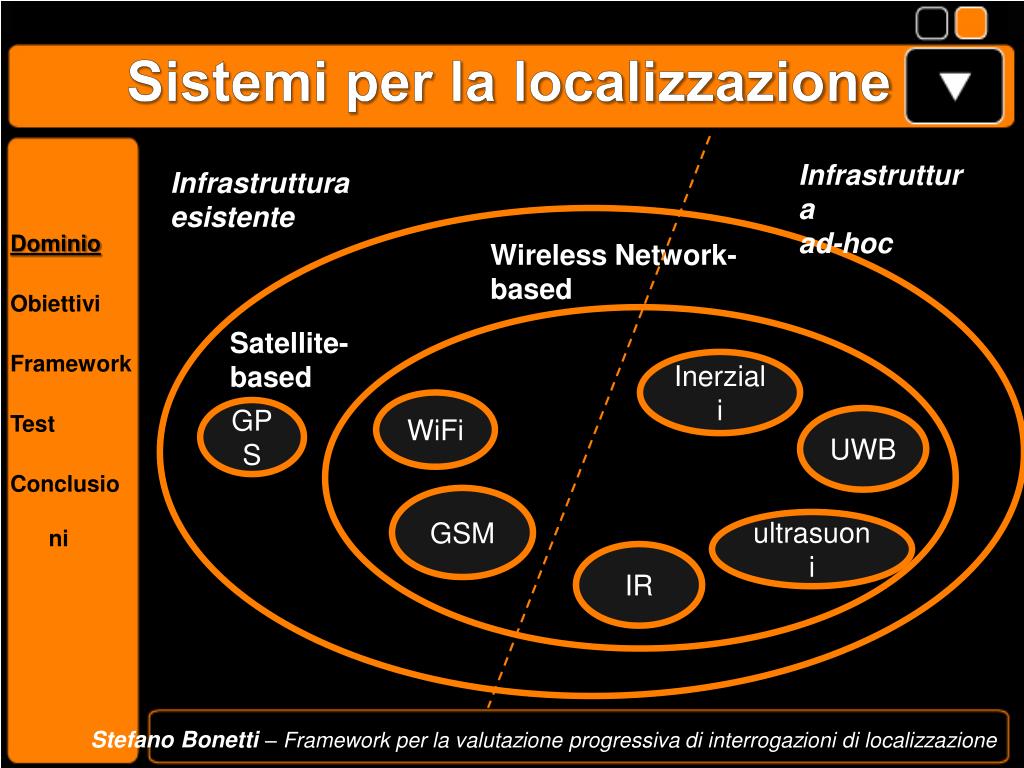 Sistemi per la localizzazione Infrastruttura ad-hoc Dominio Obiettivi Framework Test Conclusioni Infrastruttura esistente Wireless Network-based Satellite-based Inerziali WiFi GPS UWB GSM ultrasuoni IR Stefano Bonetti – Framework per la valutazione progressiva di interrogazioni di localizzazione