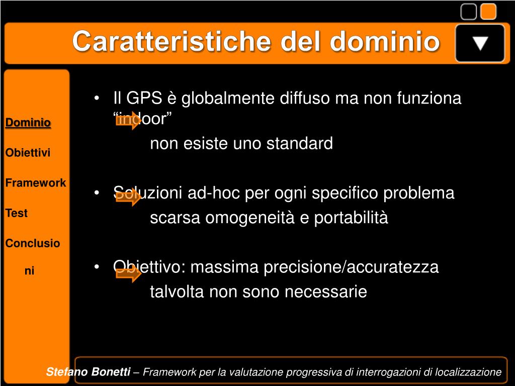 Query di localizzazione Dominio Obiettivi Framework Test Conclusioni Dove mi trovo? Precisione? 50%? 99%? Accuratezza? 1 mt? 1000 mt? Dominio? Coordinate fisiche? Stanze di un palazzo? Stefano Bonetti – Framework per la valutazione progressiva di interrogazioni di localizzazione