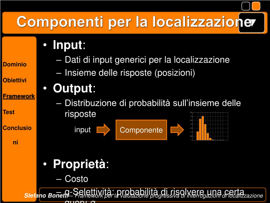 Componenti per la localizzazione Dominio Obiettivi Framework Test Conclusioni • Input: • Dati di input generici per la localizzazione • Insieme delle risposte (posizioni) • Output: • Distribuzione di probabilità sull’insieme delle risposte • Proprietà: • Costo • q-Selettività: probabilità di risolvere una certa query q Componente input Stefano Bonetti – Framework per la valutazione progressiva di interrogazioni di localizzazione
