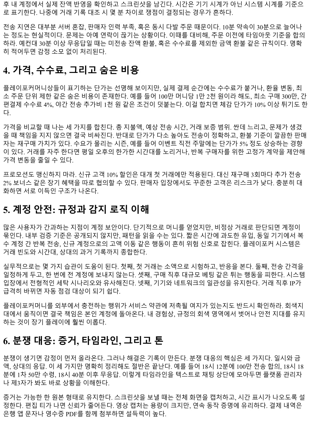 톤도중요하다. 공격적메시지는상대의방어본능을자극하고해결을늦춘다. 간결하고중립적인문장으로사 실을나열하라. 예를들어 “18:12 합의, 18:18 50만수령, 18:40 이후무응답. 19:00까지잔액전송또는환불요청 합니다.” 정도면충분하다. 과거사례에서이런톤을유지했을때환불까지평균 1시간이내로마무리됐다. 7. 재구매전략: 거래관계를자산화하기 안전하게거래하는사람은결국거래관계를자산으로만든다. 그핵심은예측가능성이다. 판매자는예측가능 한고객에게더좋은조건을제시한다. 일정주기에일정물량, 같은결제루트, 같은연락채널을유지하면관리 비용이낮아지기때문이다. 반대로매번긴급, 새벽, 고액, 다른결제수단을섞는고객은위험으로분류된다. 재구매를염두에둔다면세가지를제안해보라. 첫째, 월간약정물량과가격상한을합의한다. 시세가출렁여도 상한선이있으면심리적안정이생긴다. 둘째, 문제가생겼을때의보상규정을문서로남긴다. 예를들어지연 30분당 1% 보상같은간단한규칙이다. 셋째, 긴급연락채널을정한다. 평소에는채팅, 긴급시에는전화같은이 중채널이효과적이다. 몇번만무리없이굴러가면서로신뢰가쌓이고, 자연스럽게가격, 속도, 우선순위가좋 아진다. 거래전최종점검체크리스트 판매자이력검증: 최근한달거래캡처, 재구매후기링크, 고정연락채널확보결제수단안전성: 본인명 의계좌우선, 환불정책과영수증확인, 카드결제라우팅설명요구전송계획수립: 분할여부, 회차간격, 각회차확인방식, 타임아웃규정합의총비용계산: 단가, 수수료, 최소구매단위, 시간비용과보증범위 까지포함계정안전수칙: 소액테스트, 전송간격유지, 거래직후과도한활동자제, 기기와 IP 일관 이다섯가지만체계적으로체크해도대부분의사고를피할수있다. 비용을조금더내더라도위험을통제하는 편이전체경험을훨씬부드럽게만든다. 실제사례에서배운것들 한번은평소보다 7% 저렴한단가를제시하는신규플레이포커머니상을테스트했다. 소액 100만머니를구매했 고, 전송은 5분내완료. 문제는이튿날이었다. 같은판매자와 800만머니를거래하려는데, 결제수단이카드로 바뀌었다. 영수증은있었지만해외승인문자였고, 매입예정일안내가없었다. 여기서멈췄다. 대신기존거래처 에서 1% 높은가격으로진행했다. 일주일뒤, 첫탑플레이포커머니상판매자관련차지백이슈제보가커뮤니티 에올라왔다. 소액테스트를확장결정의근거로쓰지말아야한다는교훈을다시확인했다. 또다른사례에서는전송자체는깔끔했지만, 내계정에서이상활동감지알림이떴다. 당시나는새벽시간대에 대량전송을받고, 곧바로고액테이블에들어갔다. 시스템이위험패턴으로인식한셈이다. 이후에는전송을오 후시간대로맞추고, 수령후 1시간정도는활동을최소화했다. 그이후로는경고가사라졌다. 거래안정성못지 않게계정운영습관이중요하다는점을실감했다.