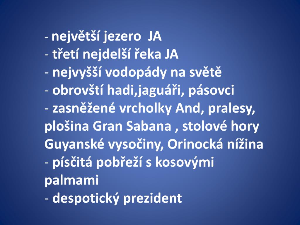 největší jezero JA • třetí nejdelší řeka JA • nejvyšší vodopády na světě • obrovští hadi,jaguáři, pásovci • zasněžené vrcholky And, pralesy, plošina Gran Sabana , stolové hory Guyanské vysočiny, Orinocká nížina • písčitá pobřeží s kosovými palmami • despotický prezident