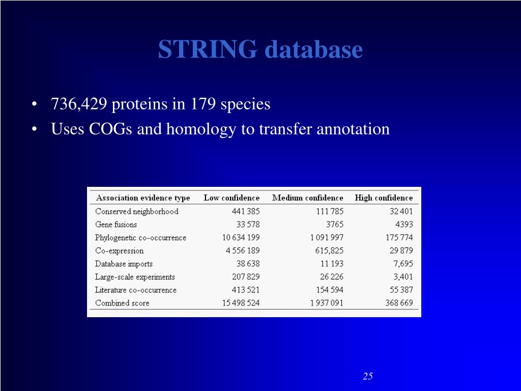 STRING database • Graphical interface for each of the evidence types • Benchmark against Kegg pathways for rankings 24