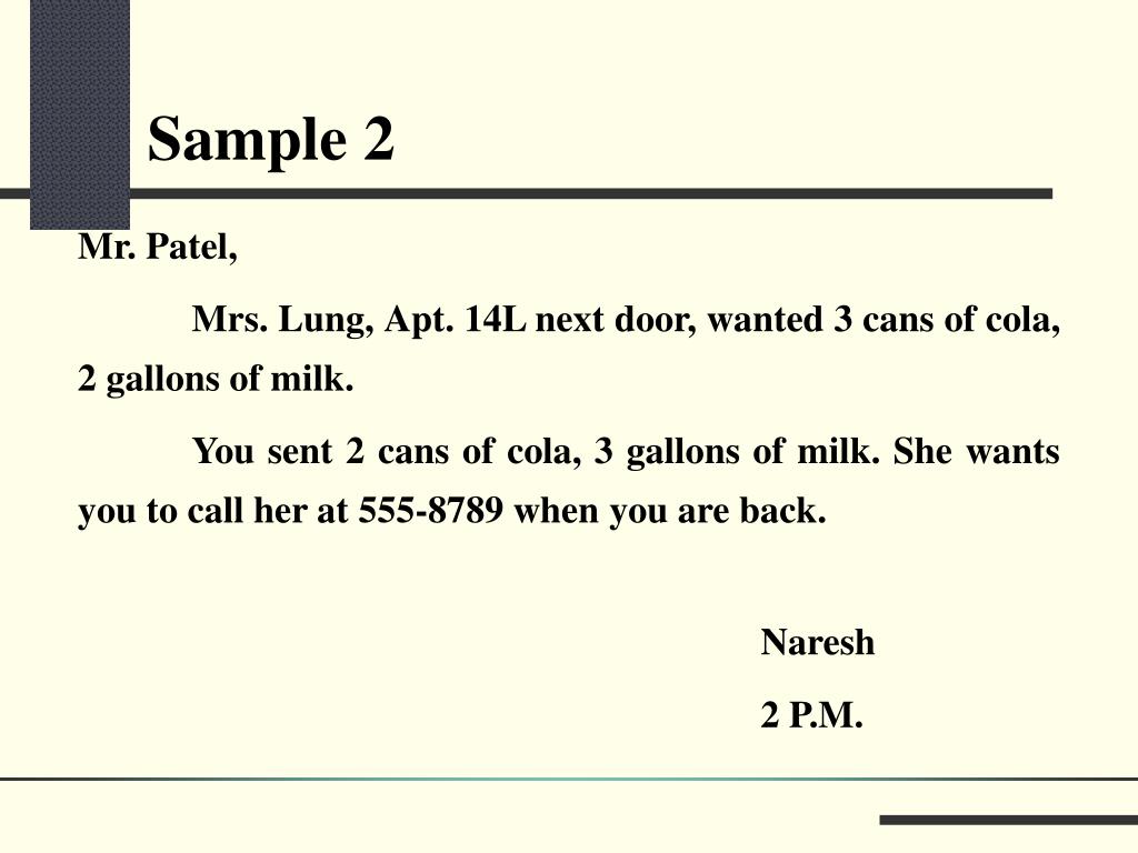 Sample 2 Mr. Patel, Mrs. Lung, Apt. 14L next door, wanted 3 cans of cola, 2 gallons of milk. You sent 2 cans of cola, 3 gallons of milk. She wants you to call her at 555-8789 when you are back. Naresh 2 P.M.