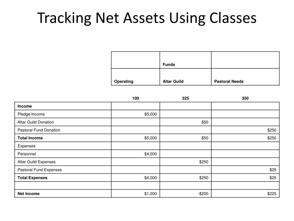 Tracking Net Assets In quickbooks (or similar accounting systems), can set up classes for restrictions. If classes are not used, can be done on an excel spreadsheet using your ledger. Journal entry to change net asset (fund balances) see page III-2 of the Manual of Business Affairs