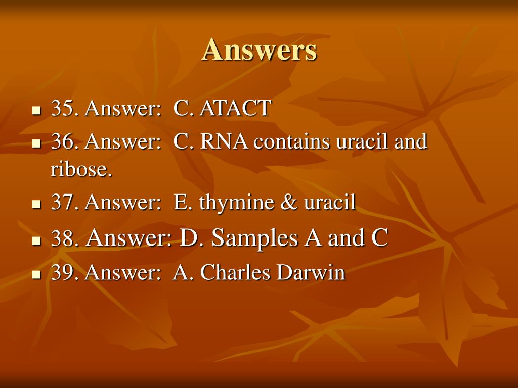 Answers • 35. Answer: C. ATACT • 36. Answer: C. RNA contains uracil and ribose. • 37. Answer: E. thymine & uracil • 38. Answer: D. Samples A and C • 39. Answer: A. Charles Darwin