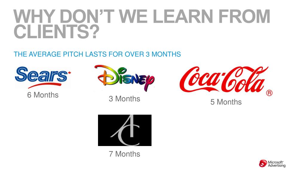 Why don’t we learn from clients? THE AVERAGE PITCH LASTS FOR OVER 3 MONTHS 6 Months 3 Months 5 Months 7 Months
