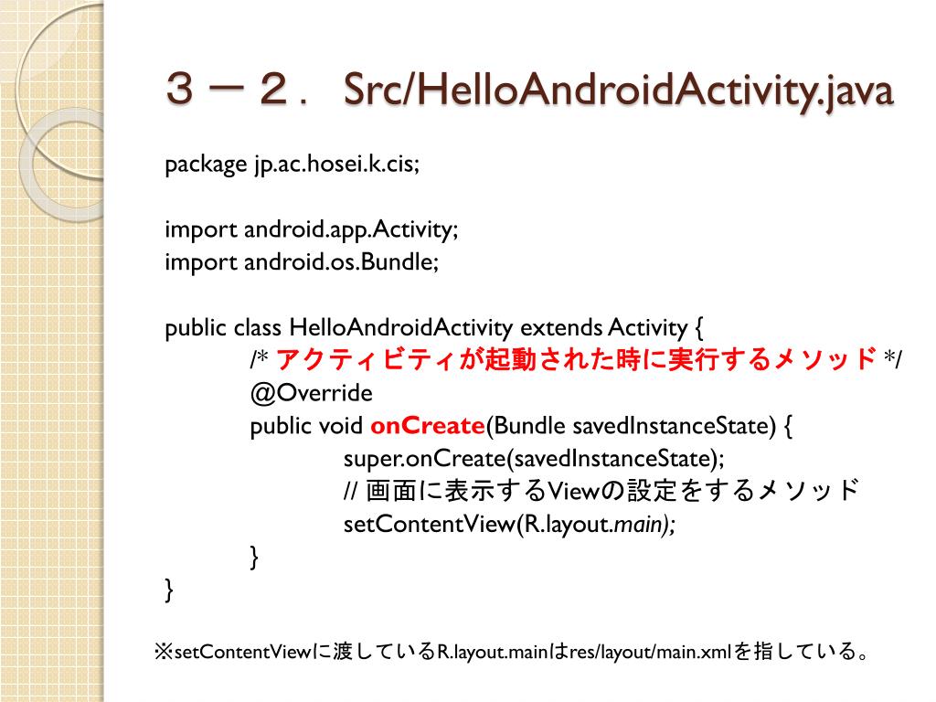 3-2.Src/HelloAndroidActivity.java package jp.ac.hosei.k.cis; import android.app.Activity; import android.os.Bundle; public class HelloAndroidActivity extends Activity { /* アクティビティが起動された時に実行するメソッド */ @Override public void onCreate(Bundle savedInstanceState) { super.onCreate(savedInstanceState); // 画面に表示するViewの設定をするメソッド setContentView(R.layout.main); } } ※setContentViewに渡しているR.layout.mainはres/layout/main.xmlを指している。
