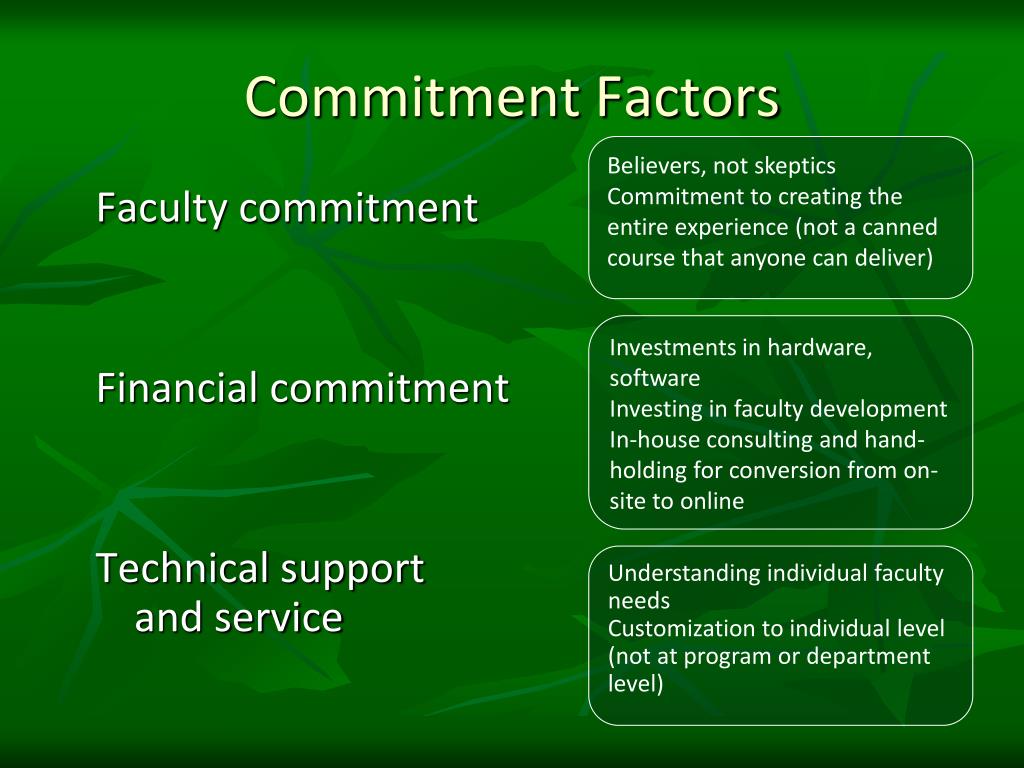 Commitment Factors Believers, not skeptics Commitment to creating the entire experience (not a canned course that anyone can deliver) Faculty commitment Financial commitment Technical supportand service Investments in hardware, software Investing in faculty development In-house consulting and hand-holding for conversion from on-site to online Understanding individual faculty needs Customization to individual level (not at program or department level)