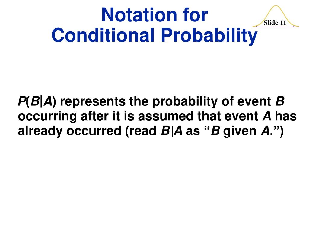 P(BA) represents the probability of event B occurring after it is assumed that event A has already occurred (read BA as “B given A.”) Notation for Conditional Probability