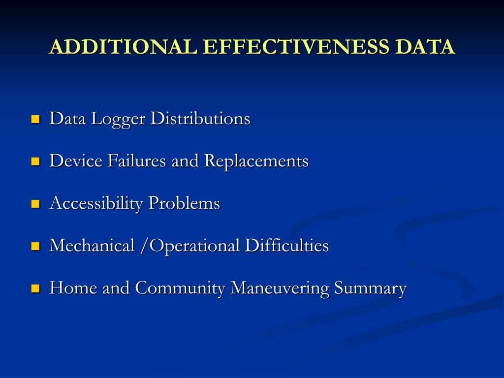 ADDITIONAL EFFECTIVENESS DATA • Data Logger Distributions • Device Failures and Replacements • Accessibility Problems • Mechanical /Operational Difficulties • Home and Community Maneuvering Summary